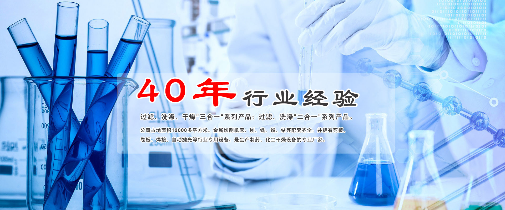 公司占地面積12000多平方米。金屬切削機床,刨、銑、鏜、鉆等配套齊全,并擁有剪板、卷板、焊接、自動拋光等行業專用設備,是生產制藥、化工干燥設備的專業廠家。 公司目前主要生產由上海醫藥工業研究院研制及受讓的100升—5000升系列雙錐回轉真空干燥機組和2升/時—100升/時系列低能無菌噴霧干燥機組。1998年引進國外技術結合國內實情研制并生產了系列過濾、洗滌、干燥“三合一”和過濾、洗滌“二合一”產品,以及2m3、3.5m3槽形攪拌真空干燥機。